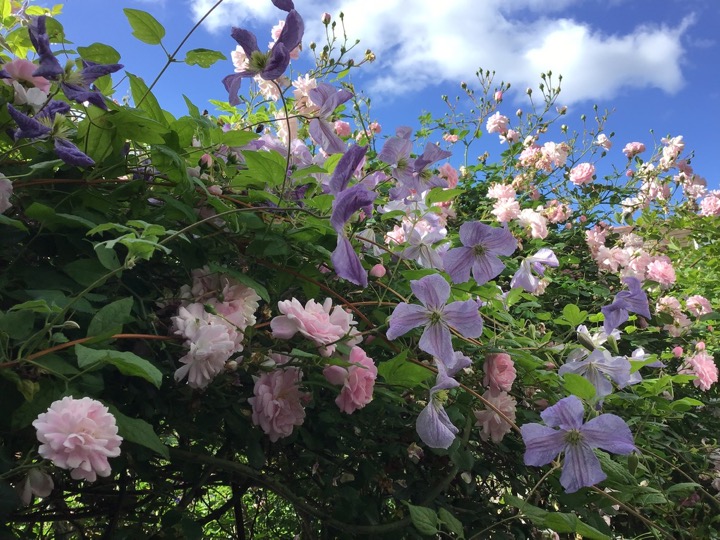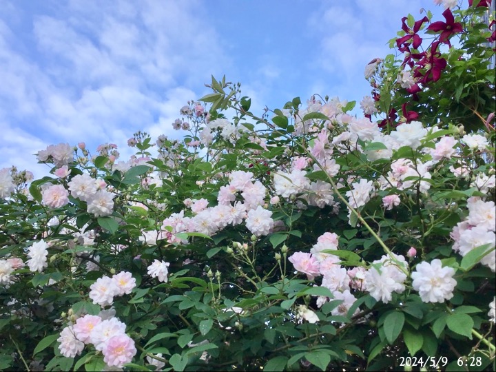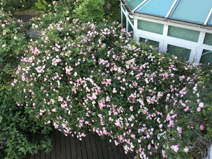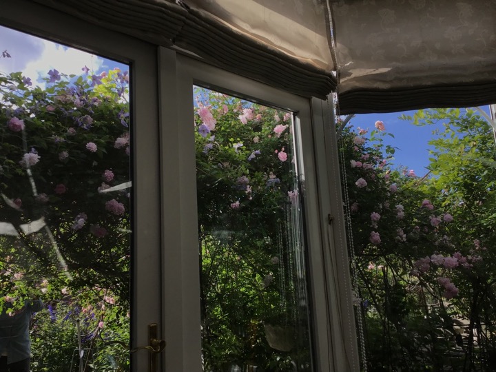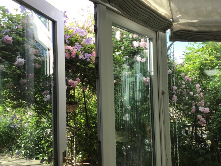 コンサバから外に出ようとして見上げると、香りのいい“デビュタント”。クレマチスの“エミリア・プラター”(鉢物)。雑誌ビズにデビュー以来、共に22年間も生き続け、目を楽しませてくれています。