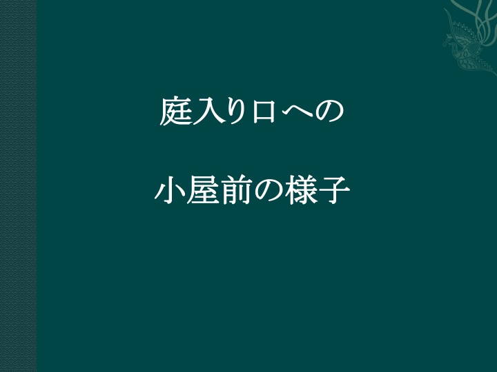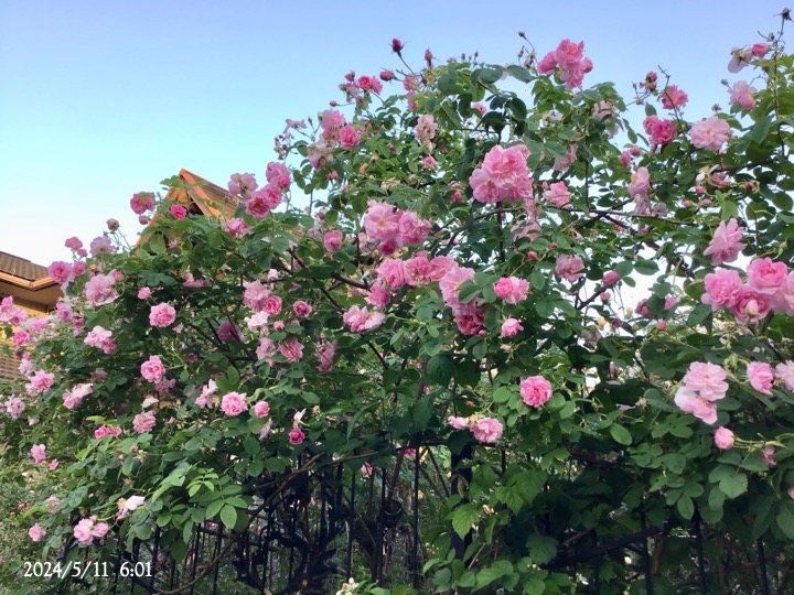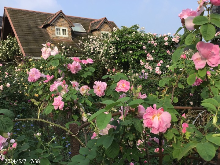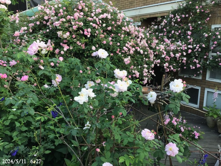 小屋左手に“ミセス マジマ” 香りよくやや紫を帯びるカップ咲でぶどう房状に開花。