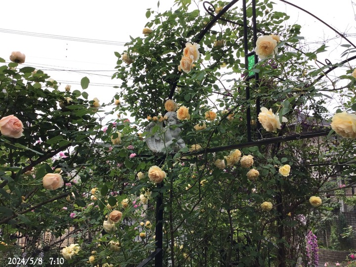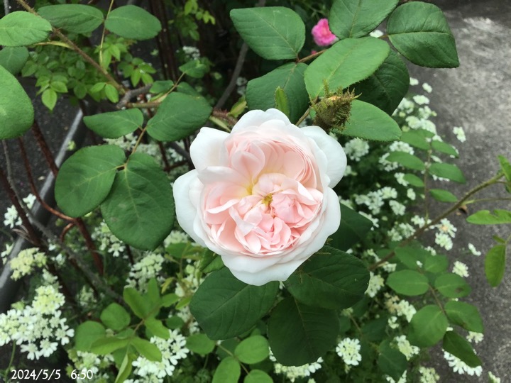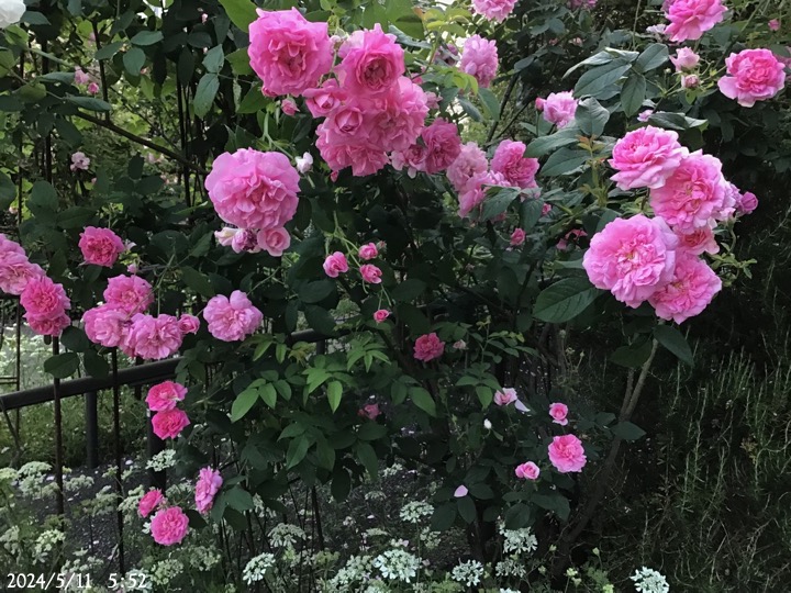25年もアンティークアーチだけのスペースに、植えてもいない白のつるバラが・・おそらく、過去に植えたバラの台木からの芽出し?で、“ロサ・ラクサ”? “野生バラ”? 遅咲き。 足元には“オルレア”。人参と同じセリ科でキアゲハが卵を産み付ける。