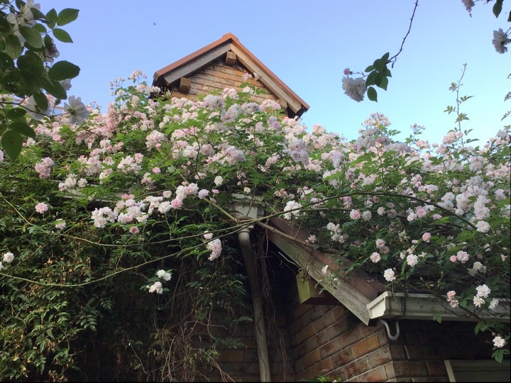 風に揺れるバラを見上げながら・・・小屋の方へ