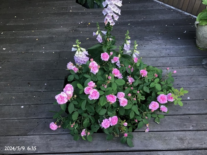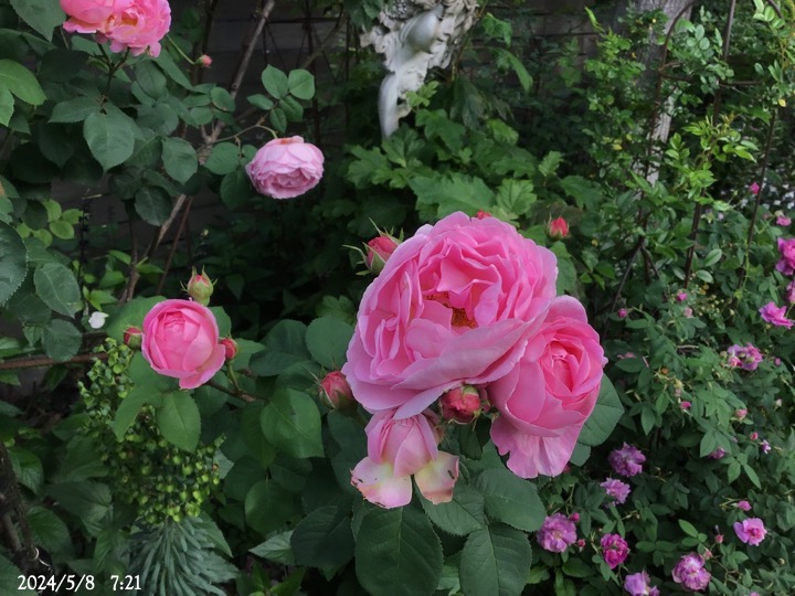 手前は“キャトル・セゾン“ 年に3〜4回ほど咲きます。ダマスクの香りを年に2回以上楽しめる唯一のバラ。