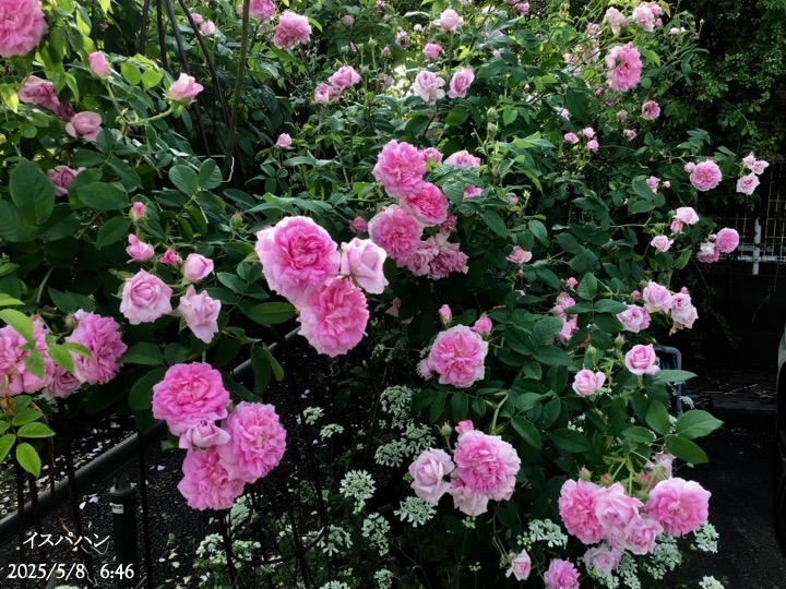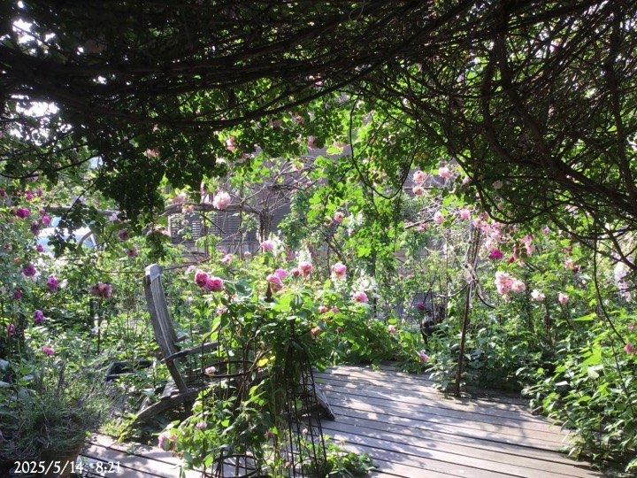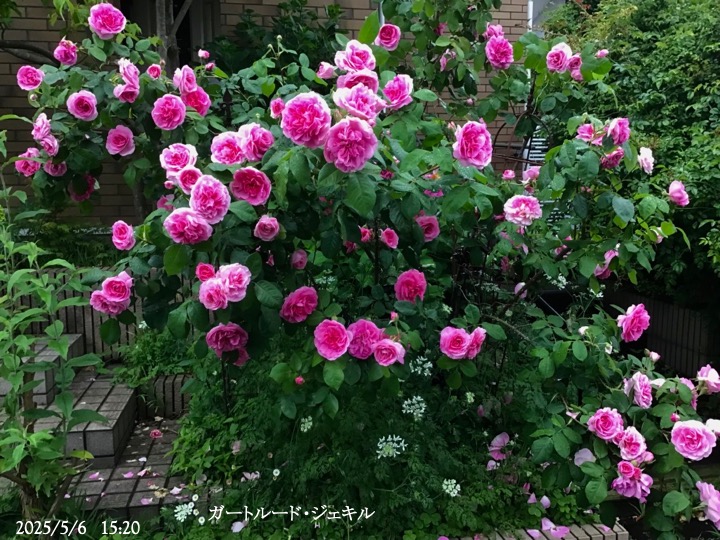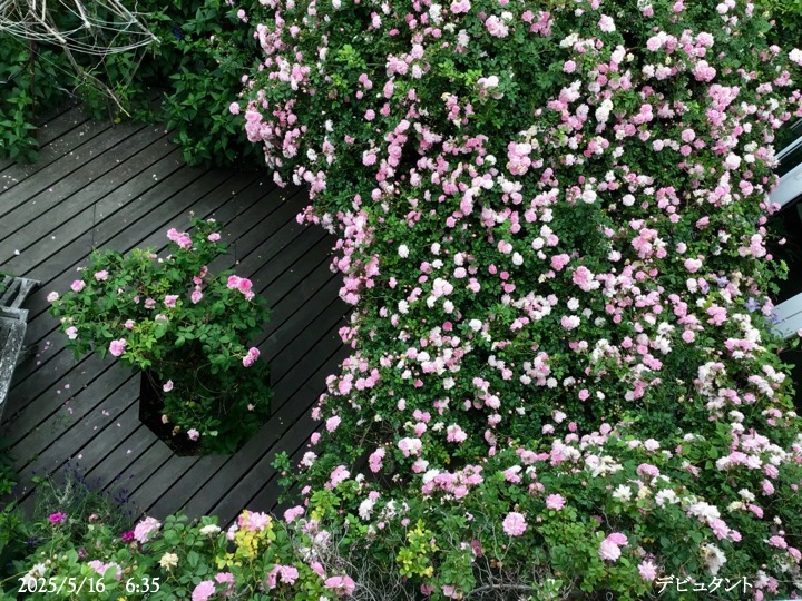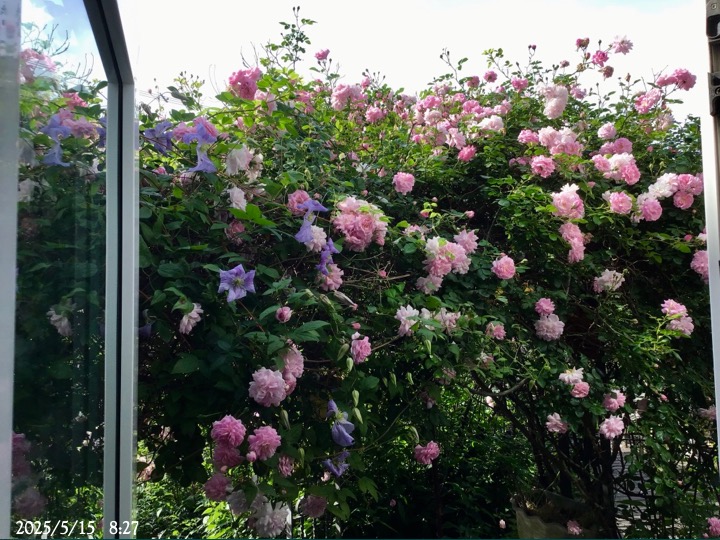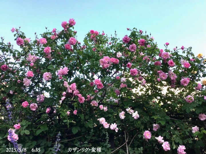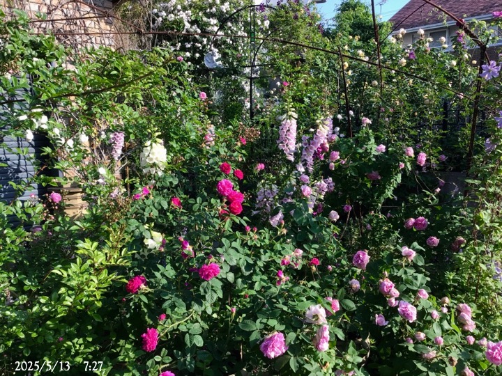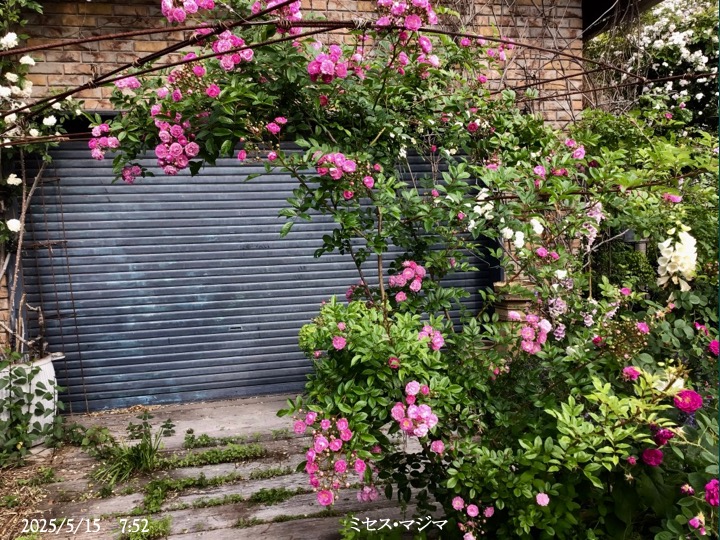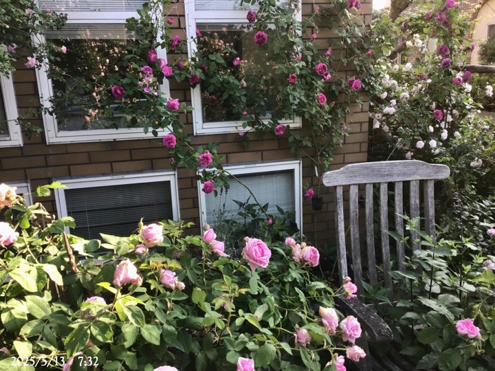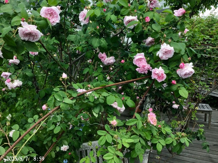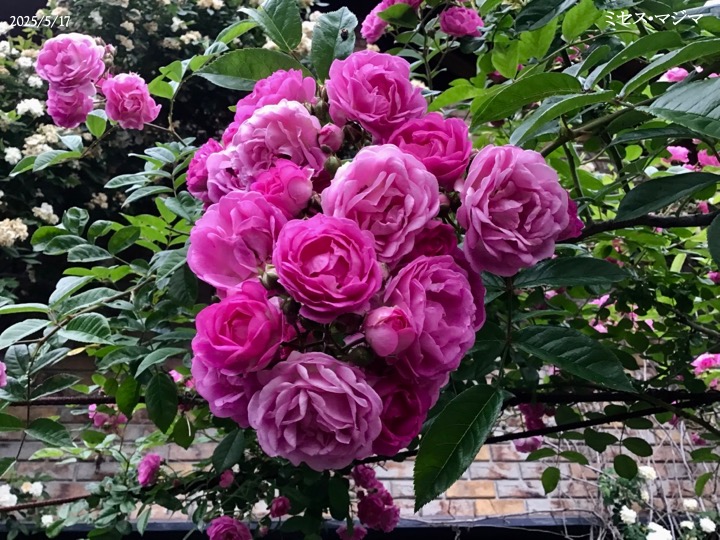 上の写真の2日後の写真 つるバラにしては珍しく良い香りがあり、紫色がかったピンク色で、房状に咲き、それぞれの花の色調が異なるのが特徴。非常に強健で、4〜5mに育つ能力がありますが、コンパクトにも育てられます。うどん粉病や黒点病に非常に耐性があります。