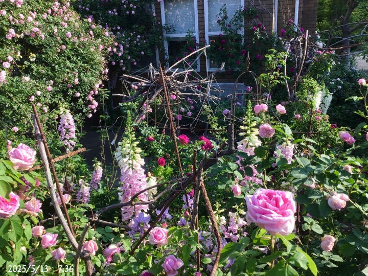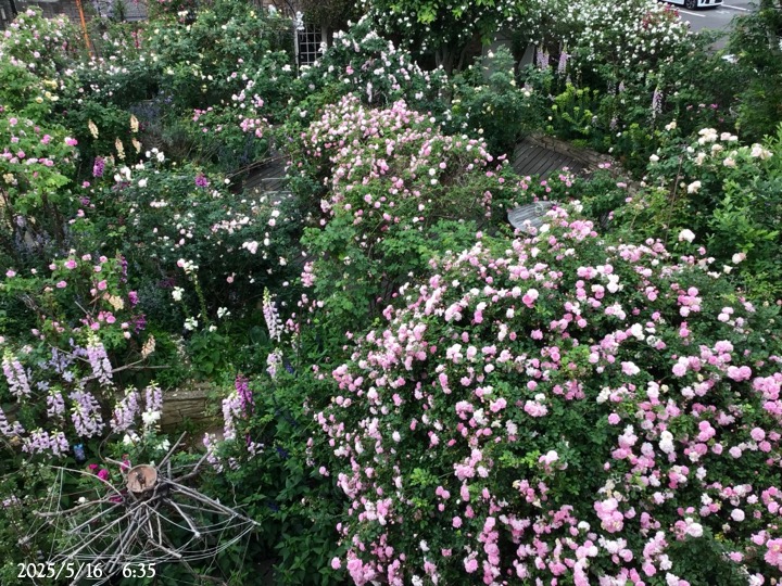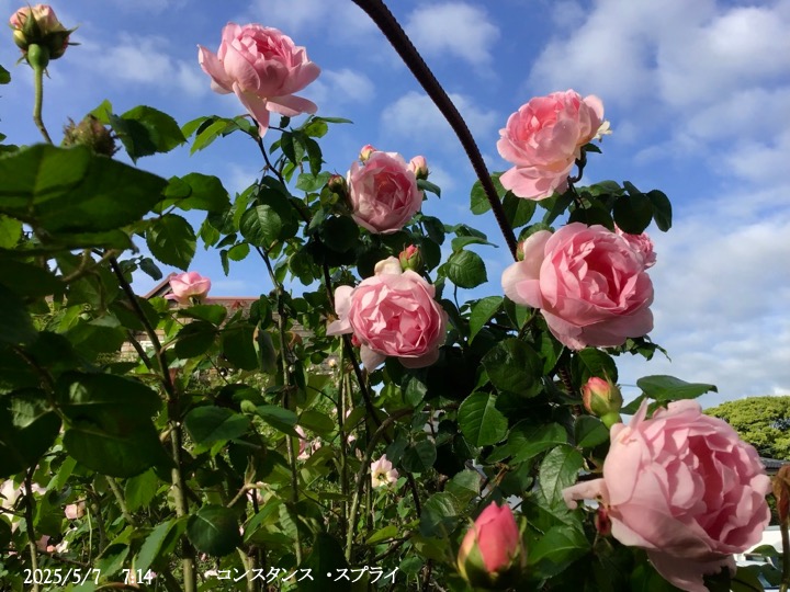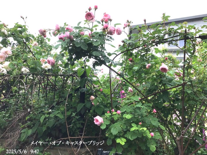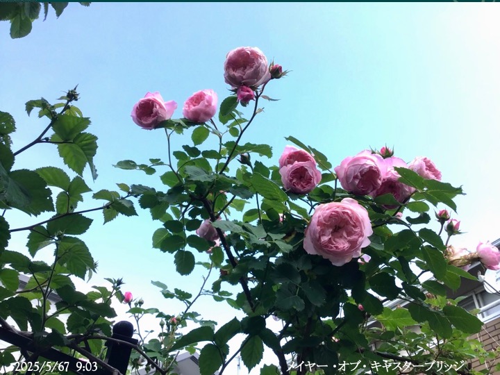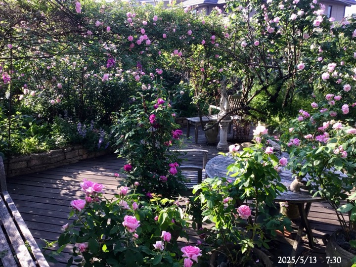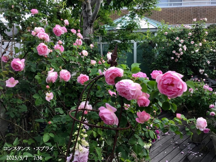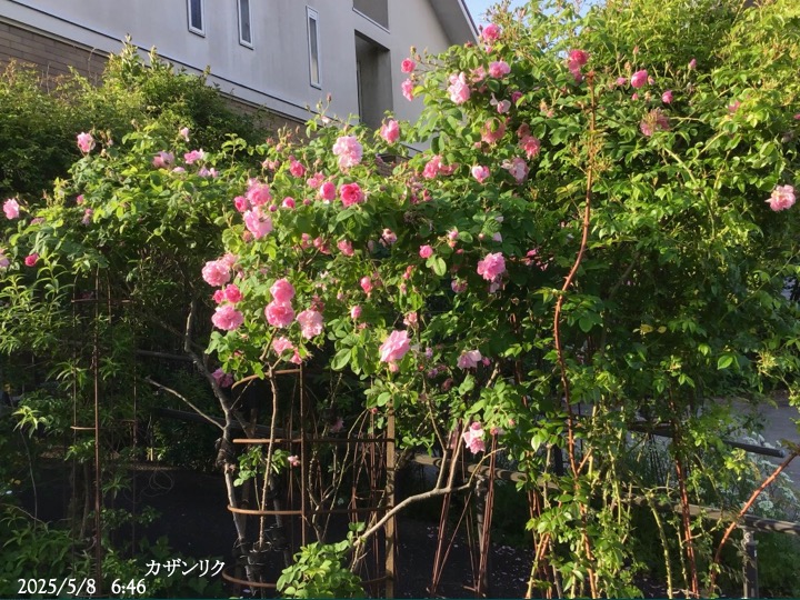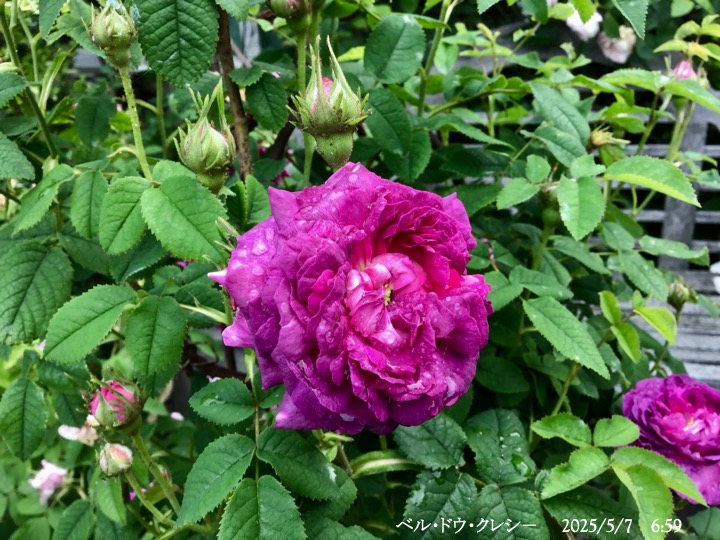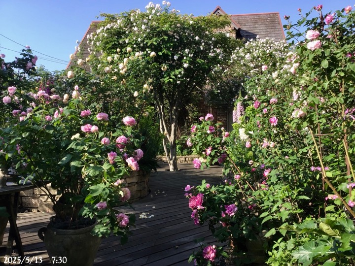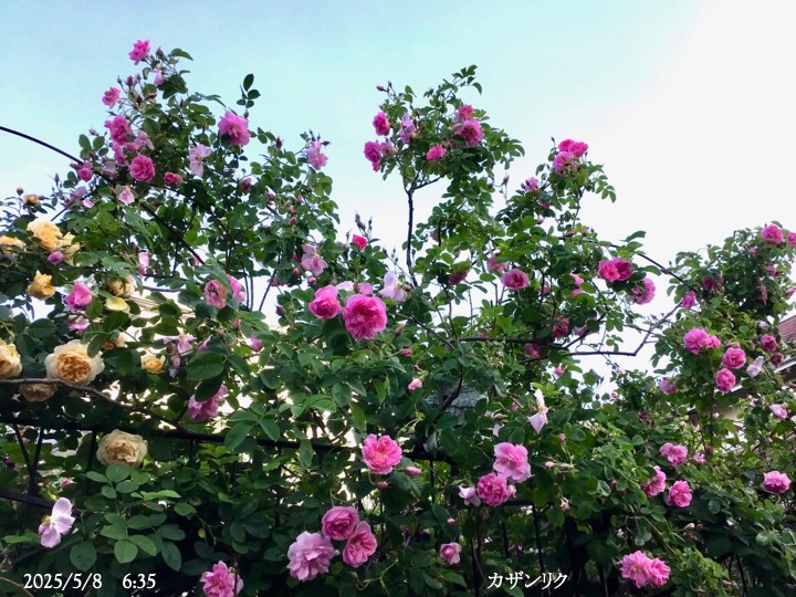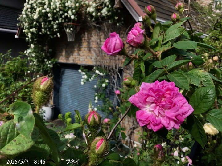 上の写真の2日後の写真 つるバラにしては珍しく良い香りがあり、紫色がかったピンク色で、房状に咲き、それぞれの花の色調が異なるのが特徴。非常に強健で、4〜5mに育つ能力がありますが、コンパクトにも育てられます。うどん粉病や黒点病に非常に耐性があります。