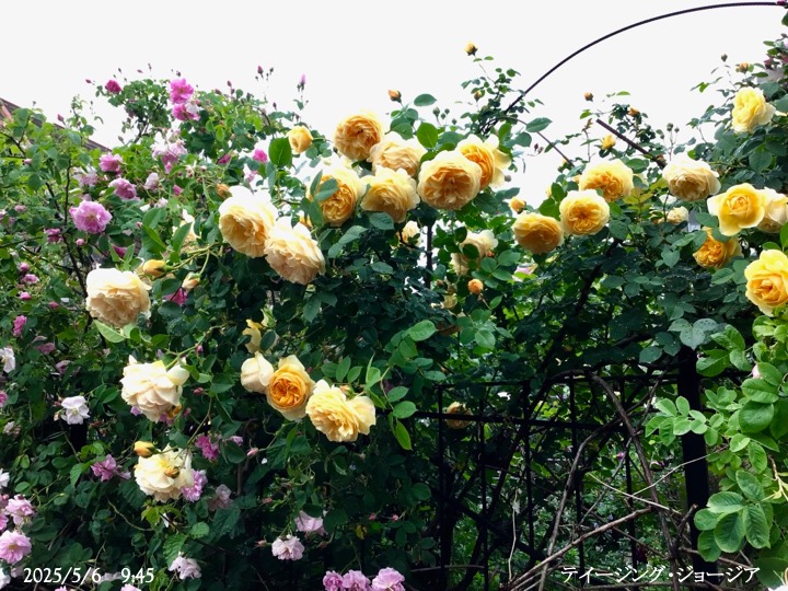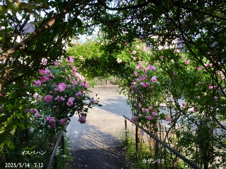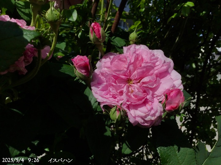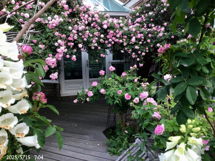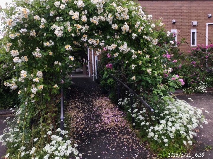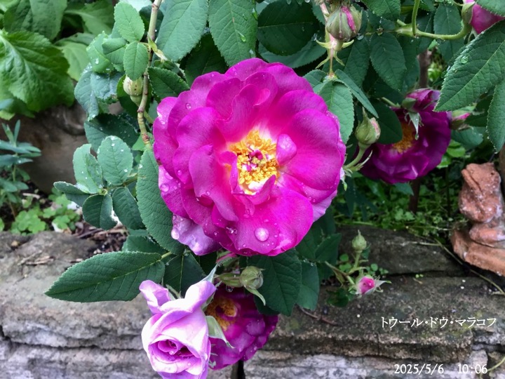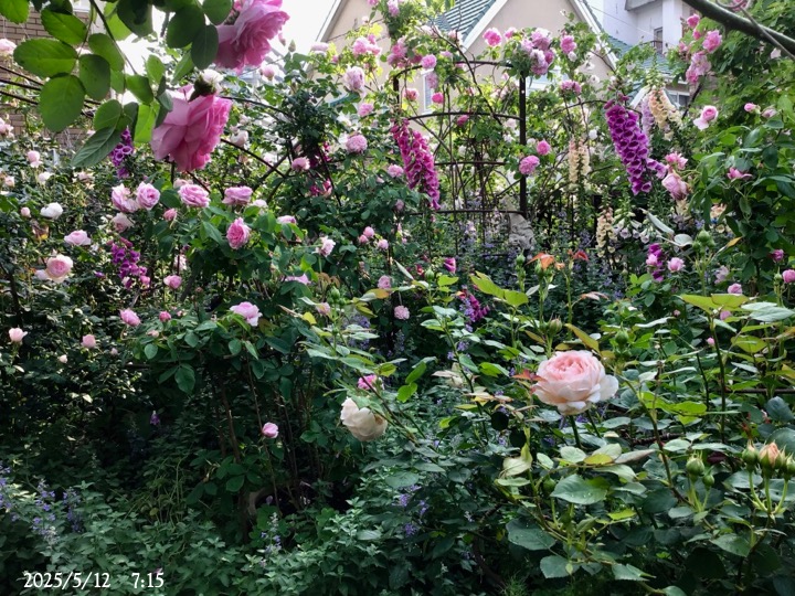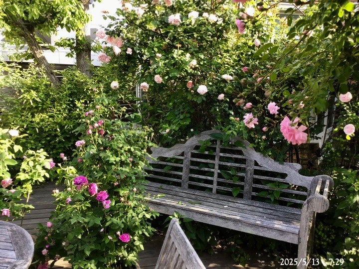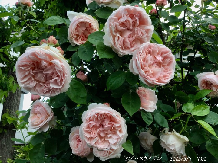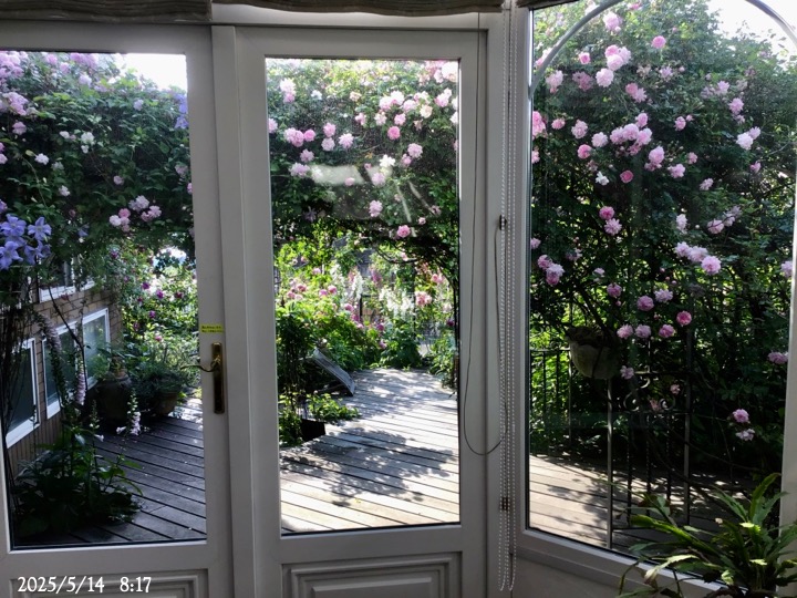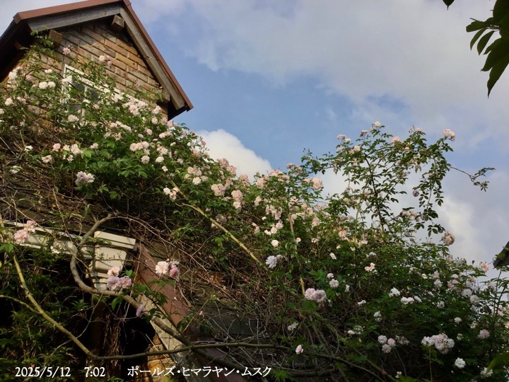上の写真の2日後の写真 つるバラにしては珍しく良い香りがあり、紫色がかったピンク色で、房状に咲き、それぞれの花の色調が異なるのが特徴。非常に強健で、4〜5mに育つ能力がありますが、コンパクトにも育てられます。うどん粉病や黒点病に非常に耐性があります。