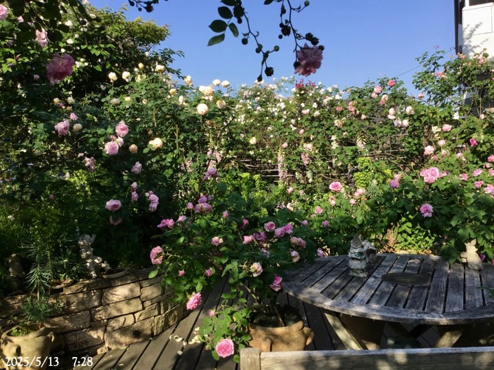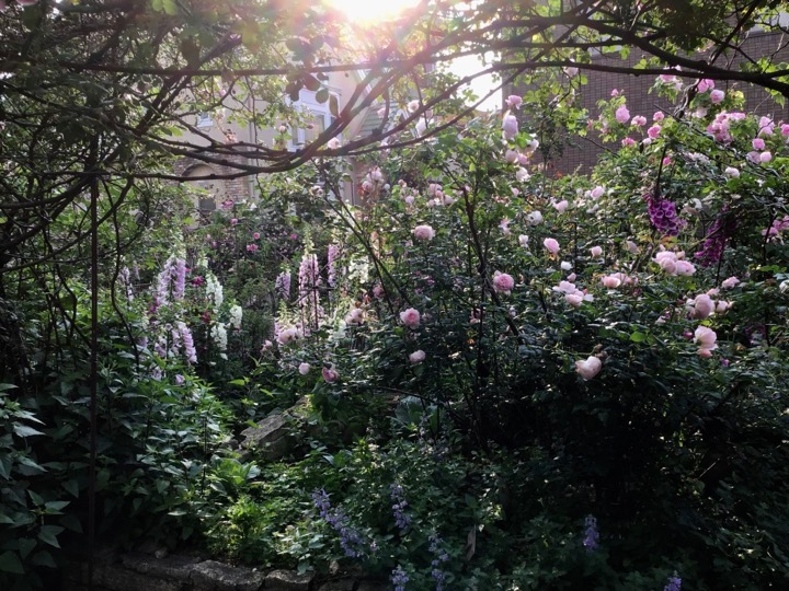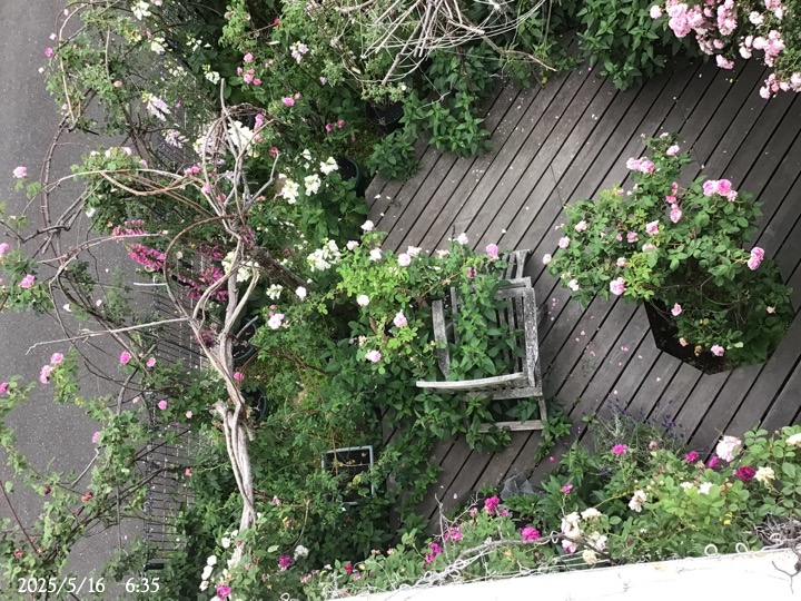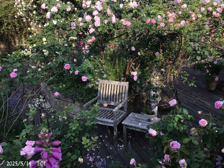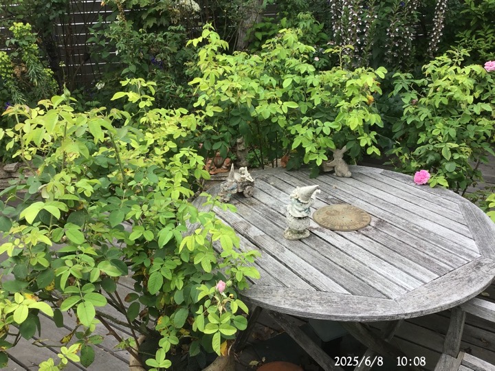 右下は日照不足で消えそうになっていた椅子の前のアンブリッジ・ローズ。この香りは手放せない。